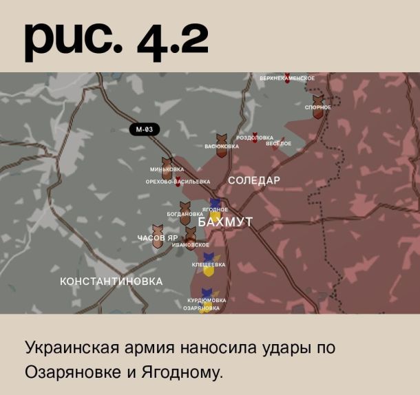 На бахмутском направлении ВСУ при поддержке артиллерии вели наступательные действия у Курдюмовки и Клещеевки и сумели занять новые позиции. Аналогичные действия российских войск в районе Ивановского были безуспешными. Также ВС РФ предприняли наземную атаку на Весёлое (населённый пункт к северо-востоку от Соледара). Без продвижения. Под обстрелами позиции ВСУ в Часовом Яре, Богдановке, Орехово-Васильевке, Миньковке, Васюковке, Роздоловке, Спорном и Верхнекаменском. Украинская армия наносила удары по Озаряновке и Ягодному. (Рис. 4)