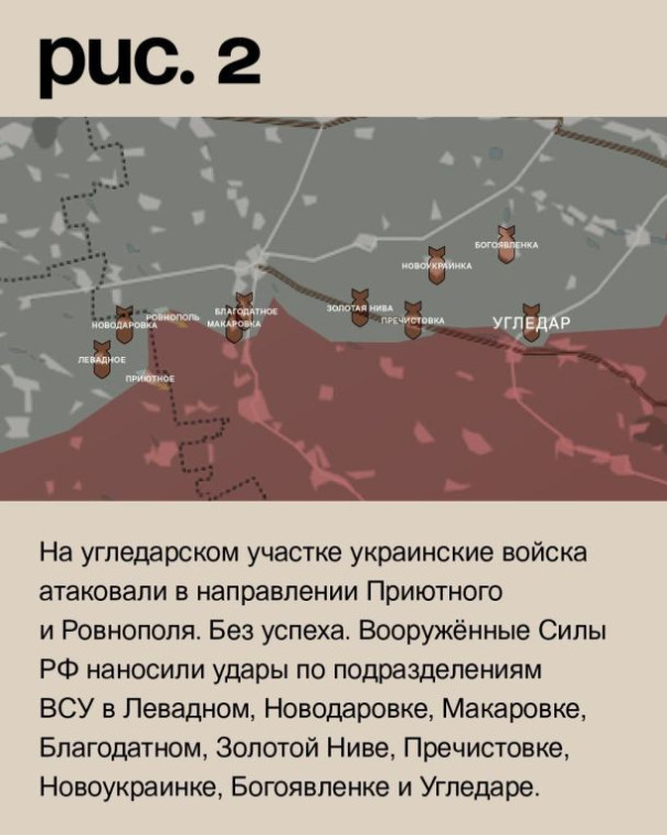 На угледарском участке украинские войска атаковали в направлении Приютного и Ровнополя. Без успеха. Вооружённые Силы РФ наносили удары по подразделениям ВСУ в Левадном, Новодаровке, Макаровке, Благодатном, Золотой Ниве, Пречистовке, Новоукраинке, Богоявленке и Угледаре. (Рис. 2)