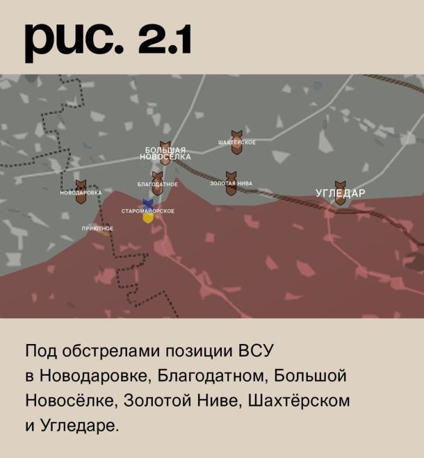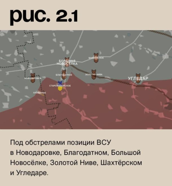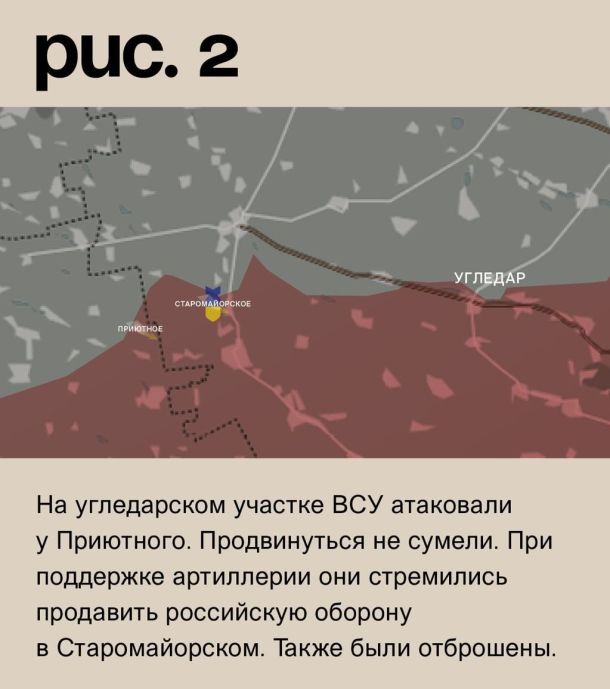 На угледарском участке ВСУ атаковали у Приютного. Продвинуться не сумели. При поддержке артиллерии они стремились продавить российскую оборону в Старомайорском. Также были отброшены. Под обстрелами позиции ВСУ в Новодаровке, Благодатном, Большой Новосёлке, Золотой Ниве, Шахтёрском и Угледаре. (Рис. 2)