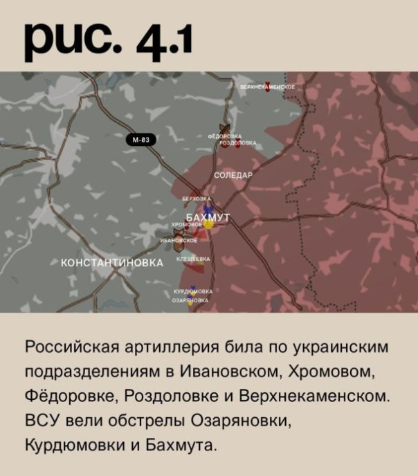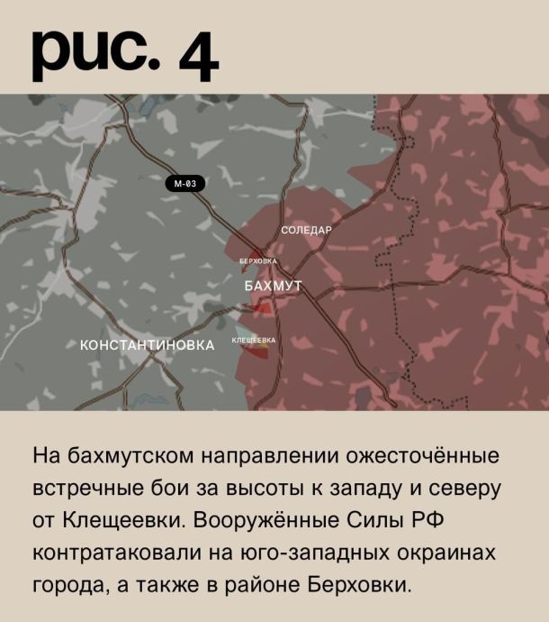На бахмутском направлении ожесточённые встречные бои за высоты к западу и северу от Клещеевки. Вооружённые Силы РФ контратаковали на юго-западных окраинах города, а также в районе Берховки. Российская артиллерия била по украинским подразделениям в Ивановском, Хромовом, Фёдоровке, Роздоловке и Верхнекаменском. ВСУ вели обстрелы Озаряновки, Курдюмовки и Бахмута. (Рис. 4)