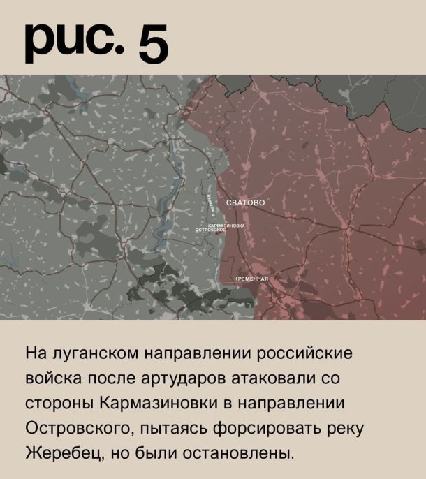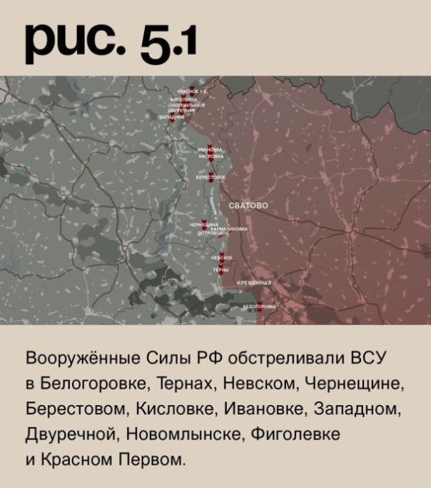 На луганском направлении российские войска после артударов атаковали со стороны Кармазиновки в направлении Островского, пытаясь форсировать реку Жеребец, но были остановлены. Вооружённые Силы РФ обстреливали ВСУ в Белогоровке, Тернах, Невском, Чернещине, Берестовом, Кисловке, Ивановке, Западном, Двуречной, Новомлынске, Фиголевке и Красном Первом. (Рис. 5)