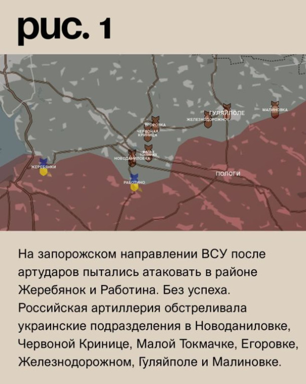 На запорожском направлении ВСУ после артударов пытались атаковать село Жеребянки. Без успеха. Такая же участь постигла их штурмовые действия у Работина. Российская артиллерия обстреливала украинские подразделения в Новоданиловке, Червоной Кринице, Малой Токмачке, Егоровке, Железнодорожном, Гуляйполе и Малиновке. (Рис. 1)