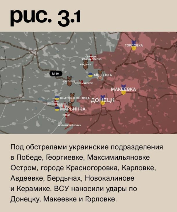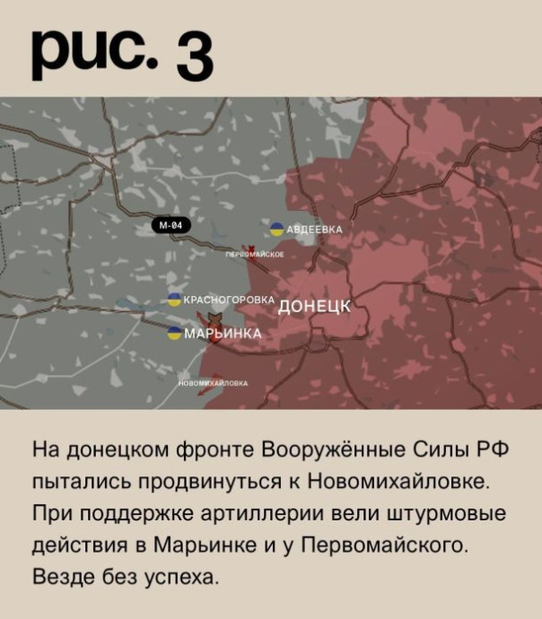 На донецком фронте Вооружённые Силы РФ пытались продвинуться к Новомихайловке. При поддержке артиллерии вели штурмовые действия в Марьинке и у Первомайского. Везде без успеха. Под обстрелами украинские подразделения в Победе, Георгиевке, Максимильяновке Остром, городе Красногоровка, Карловке, Авдеевке, Бердычах, Новокалинове и Керамике. ВСУ наносили удары по Донецку, Макеевке и Горловке. (Рис. 3)