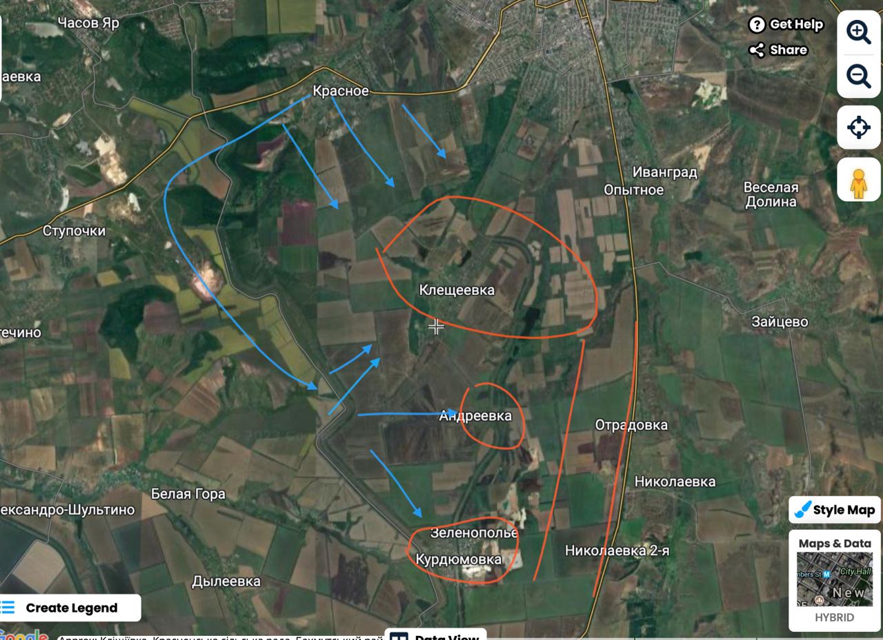 Однако, сформировав плацдарм перед Клещевкой, ВСУ столкнулось с новой незадачей - выяснилось, что их войска попадают в огненный мешок между тремя селами - Курдюмовка, Андреевка и сама Клещеевка (см. Карту 2). Попытавшись несколько раз взять Клещеевку, украинцы опытным путем выяснили, что без штурма Андреевки и Курдюмовки им не закрепиться здесь.