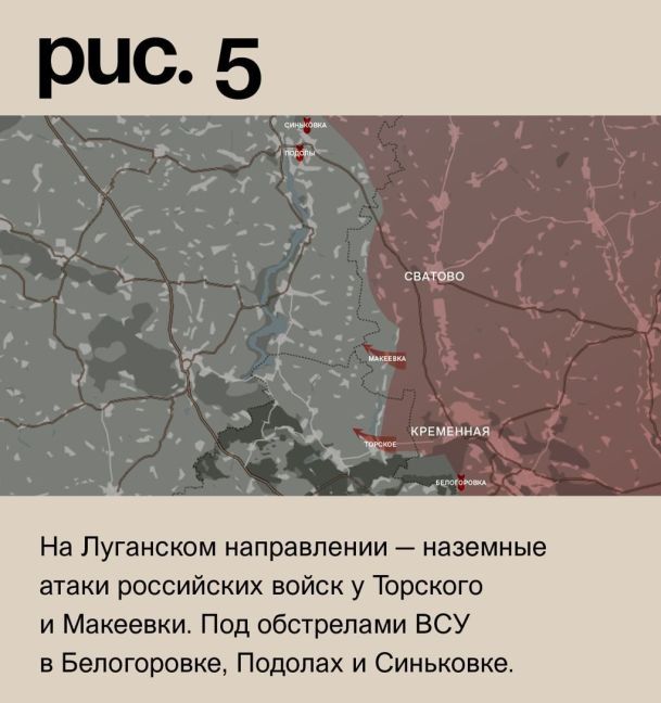 На Луганском направлении – наземные атаки российских войск у Торского и Макеевки. Под обстрелами ВСУ в Белогоровке, Подолах и Синьковке. (Рис. 5)