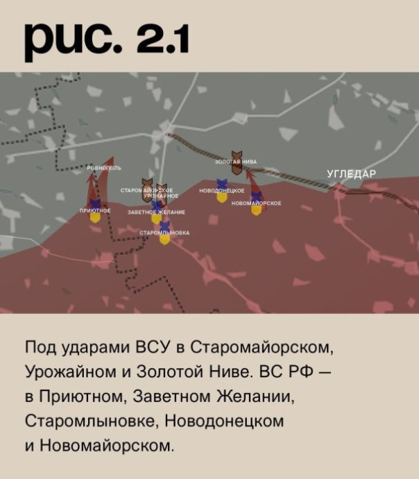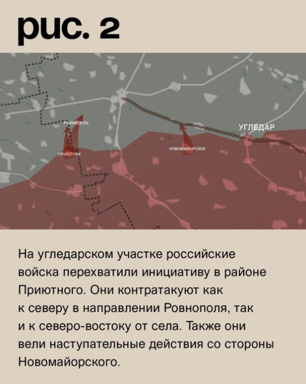 На угледарском участке российские войска перехватили инициативу в районе Приютного. Они контратакуют как к северу в направлении Ровнополя, так и к северо-востоку от села. Также они вели наступательные действия со стороны Новомайорского. Под ударами ВСУ в Старомайорском, Урожайном и Золотой Ниве. ВС РФ – в Приютном, Заветном Желании, Старомлыновке, Новодонецком и Новомайорском. (Рис. 2)