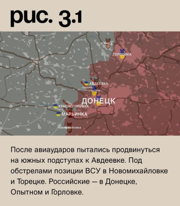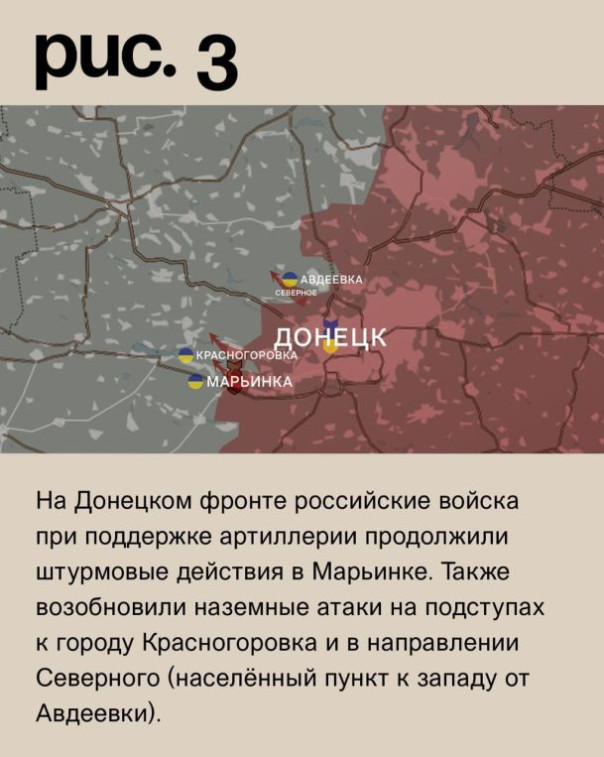 На Донецком фронте российские войска при поддержке артиллерии продолжили штурмовые действия в Марьинке. Также возобновили наземные атаки на подступах к городу Красногоровка и в направлении Северного (населённый пункт к западу от Авдеевки). После авиаударов пытались продвинуться на южных подступах к Авдеевке. Под обстрелами позиции ВСУ в Новомихайловке и Торецке. Российские – в Донецке, Опытном и Горловке. (Рис. 3)