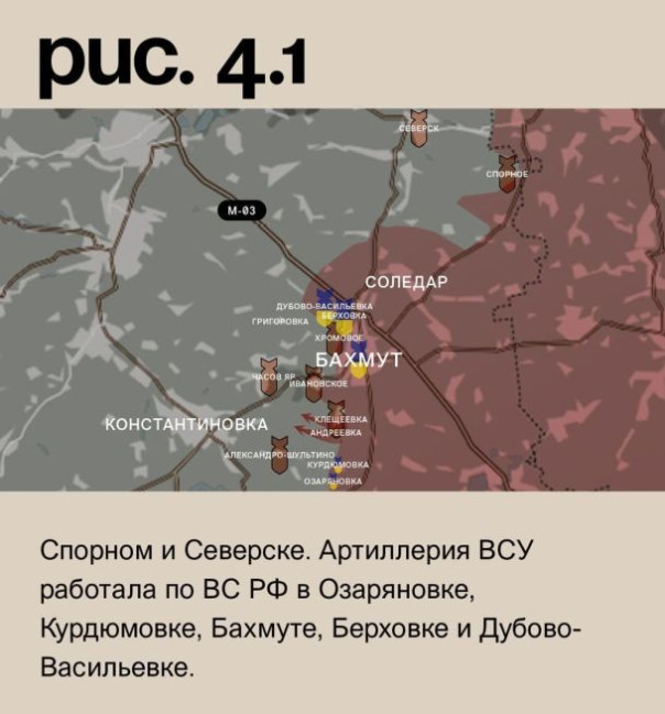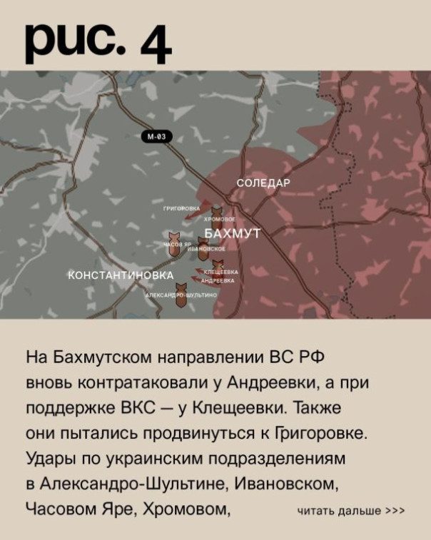 На Бахмутском направлении ВС РФ вновь контратаковали у Андреевки, а при поддержке ВКС – у Клещеевки. Также они пытались продвинуться к Григоровке. Удары по украинским подразделениям в Александро-Шультине, Ивановском, Часовом Яре, Хромовом, Спорном и Северске. Артиллерия ВСУ работала по ВС РФ в Озаряновке, Курдюмовке, Бахмуте, Берховке и Дубово-Васильевке. (Рис. 4)