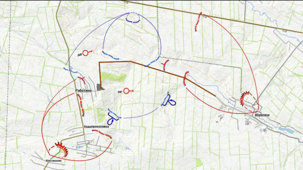 То же самое происходит и на северном фланге под Вербовым - наши начали методично зачищать опорники врага вдоль грунтовки, связывающей Вербовое с Работино. Это была единственная более- менее рабочая транспортная артерия, по которой укропы кое-как пытались двигаться на Вербовое. И вот четыре опорника врага были заняты нами здесь на этой неделе. И почти семь на противоположном фланге у Работино.