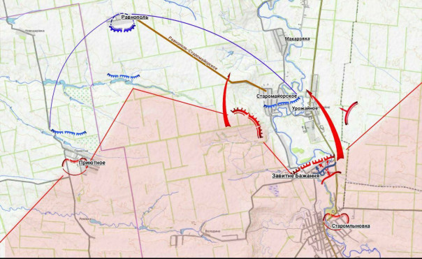 Следующий рубеж: село Мирное - Марфополь - 4 опорника врага взято (см. Карту 2). Далее рубеж село Малиновка-Приютное-Старомайорское (Времьевской выступ) - 5 опорников врага, три единицы бронетехники.