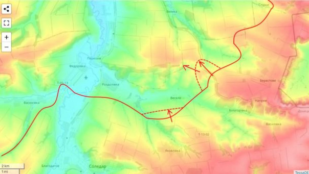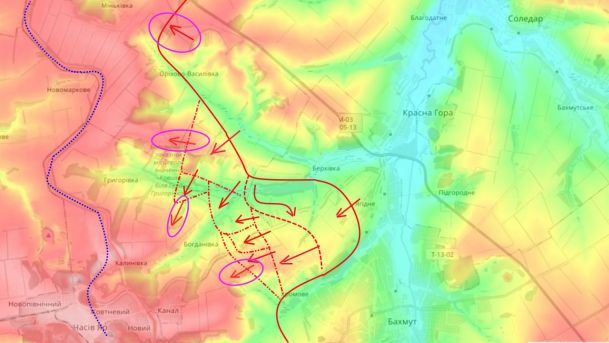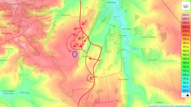 «Пешие группы и технику фиксируются уже восточнее Богдановки, что свидетельствует о продвижении врага. Зафиксированы, к сожалению, удачные штурмовые действия врага на высоте 188.6 возле Хромового. На распространяемых врагами кадрах виден десант, дальнейшая зачистка и закрепление сил противника. Кроме того, у русских успехи между Бахмутом и Ивановским, еще в начале декабря была утрачена высота 144.0...», с сожалением комментирует ситуацию крупнейший украинский военный телеграмм-канал в своей сводке.