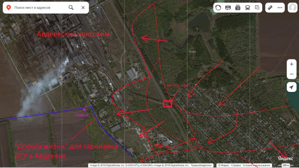 Наши части по последних данным смогли занять территорию местного АТП, а также крайние здания за ЖД развязкой перед входом в Авдеевский коксохим. От этого места до "стелы" осталось чуть более 300 метров, а от АТП до "Дороги жизни" даже менее.