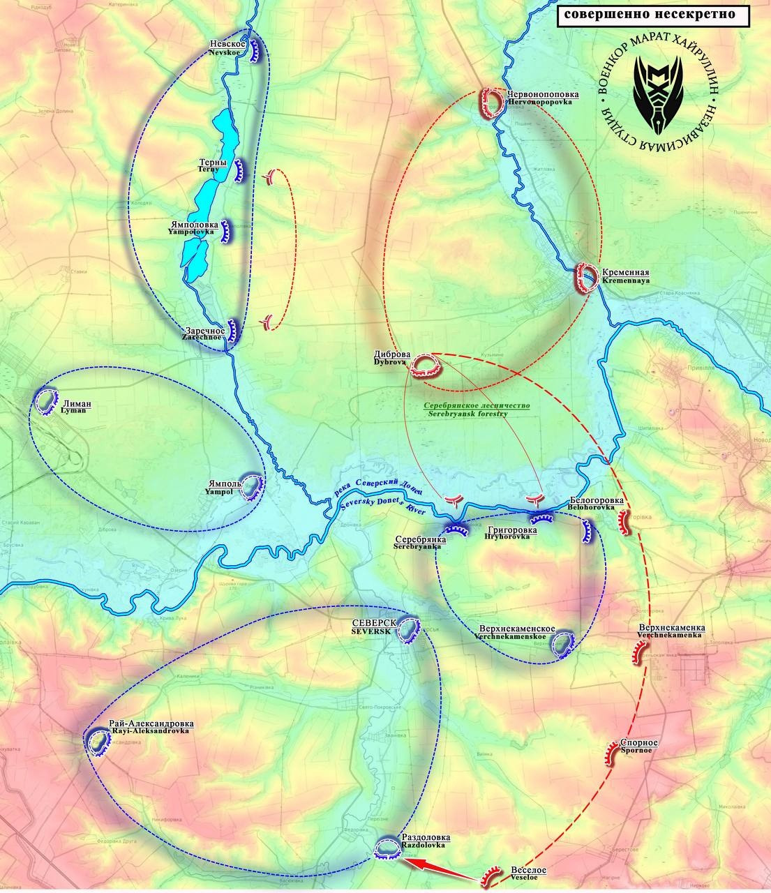 К этому надо прибавить, что в Серебрянском лесничестве вторую неделю идет небольшое, но стабильное движение на рубеже Диброво-Серебрянка. Наши практически уже полностью контролируют пойму реки Северский Донец на рубеже Григоровка-Серебрянка.