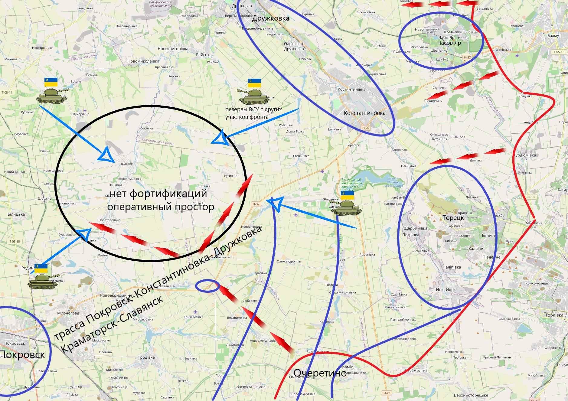 Теперь, задача оставшейся наспех нарытой третьей линии обороны, максимально задержать нас и дать время ставке ВСУ подтянуть стратегические резервы, разбавленные наловленными "ухилянтами".(В мае озвучивалась желательная цифра будущего улова в 125 тыщ, включая сифилитикоф и спидоносцев) А они обязательно их(резервы) подтянут, ведь после третьей линии обороны идёт чистое незамутненное окопами и блиндажами поле, до самых горизонтов. А если, нет стратегических резервов в глубине, то снимут с пассивных участков фронта. И вот тут начнется самое интересное. Я думаю, наш генштаб Уже предположил откуда что снимут оппоненты, и готовит там сюрпризы. А снимут с тихих участков. Возможно, Кисловка первая ласточка. Но есть два места, откуда для нас нежелательны эти маневры резервами - Часов Яр и огромная Торецкая агломерация. В Часов Яре, при большой скученности, идёт массовая утилизация, а Торецк-Ньюйорк-Пивничное потенциальные сидельцы для котла, вот пусть там все и сидят. Взятие Керамика и Новокалиново - это не только контроль над очень удобной рокадой до Очеретино, хоть и не очень пропускной, но и как раз блокирование переброски резервов из под Торецка.