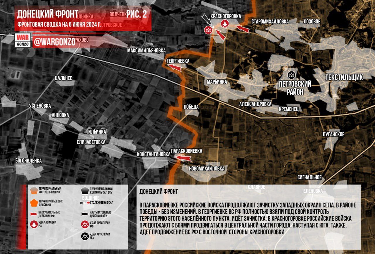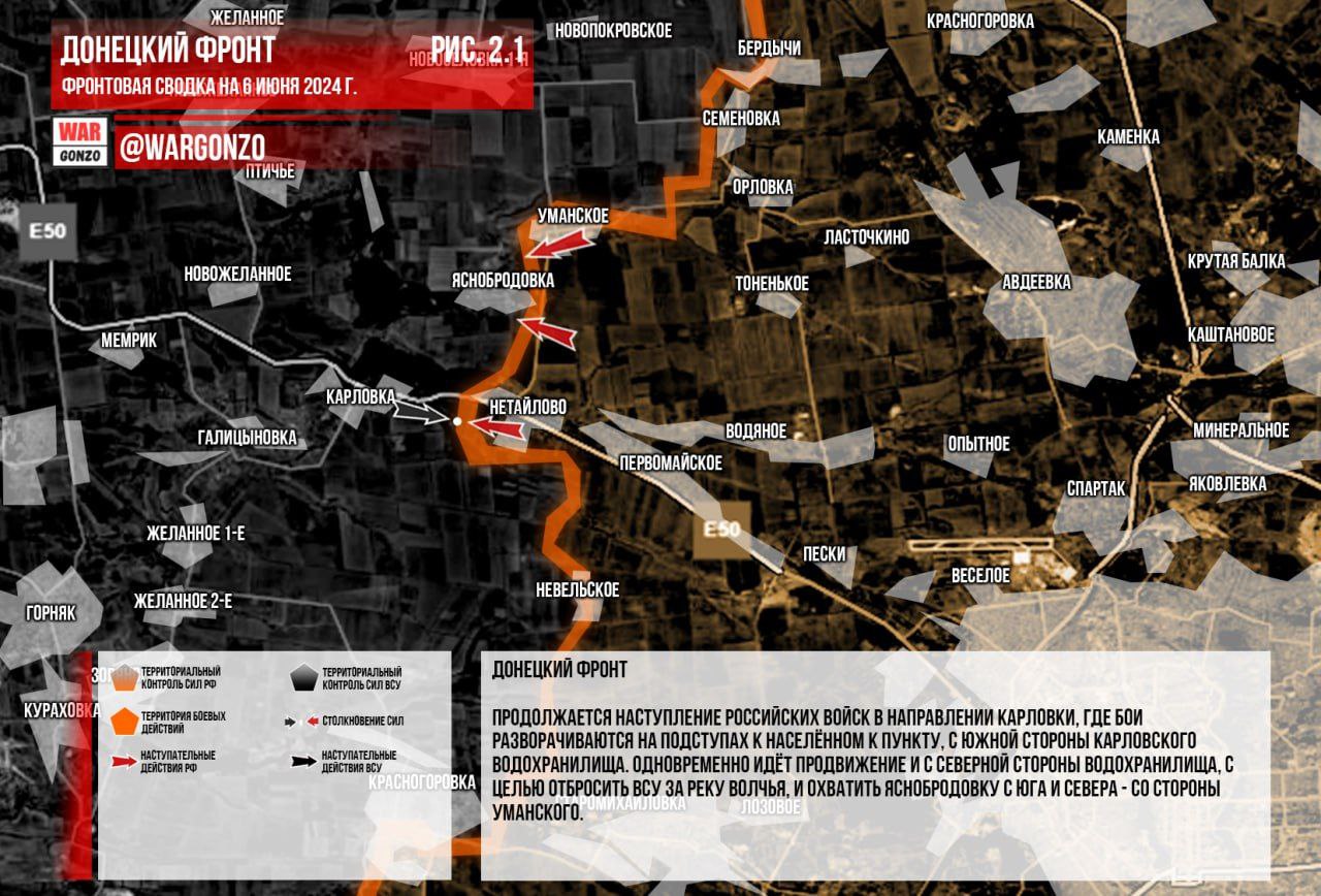 Донецкий фронт. В Парасковиевке российские войска продолжают зачистку западных окраин села. В районе Победы - без изменений. В Георгиевке ВС РФ полностью взяли под свой контроль территорию этого населённого пункта, идёт зачистка. В Красногоровке российские войска продолжают с боями продвигаться в центральной части города, наступая с юга. Также, идет продвижение ВС РФ с восточной стороны Красногоровки. Продолжается наступление российских войск в направлении Карловки, где бои разворачиваются на подступах к населённом к пункту, с южной стороны Карловского водохранилища. Одновременно идёт продвижение и с северной стороны водохранилища, с целью отбросить ВСУ за реку Волчья, и охватить Яснобродовку с юга и севера - со стороны Уманского. Также, продолжаются бои в районе населённого пункта Сокол и на окраинах Новоалександровки. (Рис. 2)