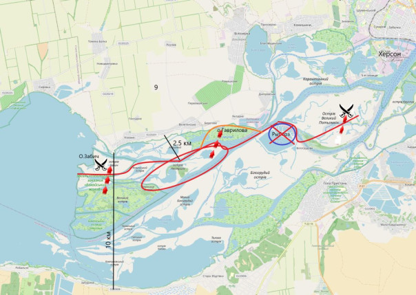 Наши добили остатки хохлов в Рыбхозе на острове Белогрудый. Что позволило форсировать Днепр в очень непростом месте - остров Гаврилова. Высокий тростник в плавнях отлично маскирует.