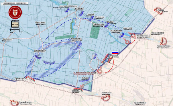 Западнее н.п. Новогродовка ВС РФ расширили зону контроля. Приходят сообщения о боях в районе н.п. Лысовка. Движение наших подразделений здесь позволит взять под огневой контроль участок трассы М 30( Е50), по которому идёт снабжение ВСУ в н.п. Селидово, куда на данный момент переброшена основная часть подкреплений на Покровском участке.