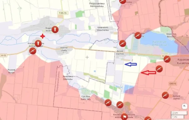Российские войска давят на Дачное с севера и на упомянутый Констонтинополь с юга. Важнейший в этой местности мост уничтожен, трасса Н-15 под плотным огневым контролем ВС РФ. Развязка близка. Источник