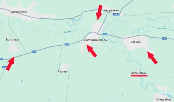Поступают сообщения о полном освобождении села Зеленовка и о перерезании трассы, которая ведёт из Запорожской области в упомянутое село Константинополь. Речь идёт о выходе наших войск к дороге Н15 южнее Богатыря. Украинские ресурсы этот участок дороги начали обозначать как «серую зону», а это означает, что ВСУ участок дороги «под» селом Богатырь уже не контролируют.