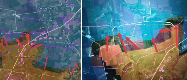 Севернее Александрополя и от Новоеленовки ВС РФ ведут бои в направлении Яблоновки, а также продвигаются в направлении западной части Клебан-Быкского водохранилища. Севернее Новоалексеевки зачистили опорники ВСУ и продвинулись в направлении Русина Яра. Севернее Новой Полтавки, по данным Котенка, ВС РФ зашли в Полтавку и выбили противника из Попова Яра.