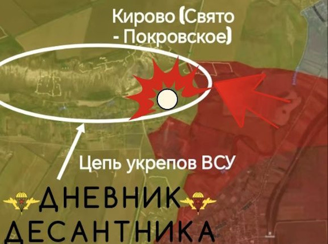 В ходе наступления ВС РФ на КИРОВО (Свято-Покровское) противник утратил контроль над основной логистической трассой снабжения Т-05-13. Наши подразделения заняли половину этого населённого пункта. ВСУ отошли на западные окраины.