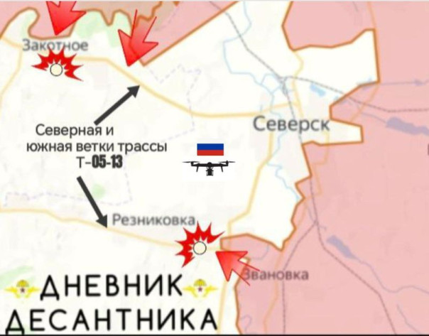 Им на встречу продавливают вражескую оборону подразделения вдоль трасс Т-0504 (севернее Яблоновки) и Н-20 (севернее Александро-Калиново) в направлении укрепрайона ВСУ у перекрёстка этих дорог, являющегося одним из ключевых в данном районе.