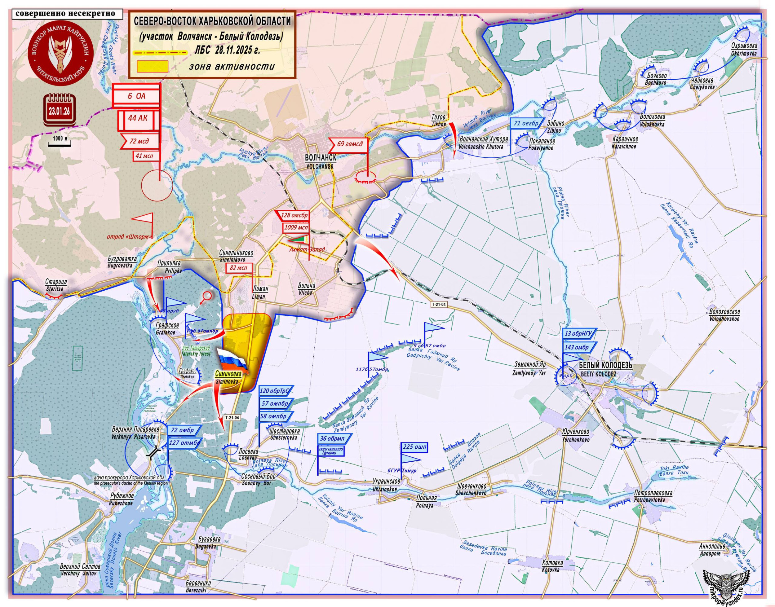 23 января 2026 г. был установлен контроль над н.п. Симиновка (50°12′52″ с. ш. 36°53′40″ в. д. - население 330 чел. в 2001г., до 2016 н.п. Червоноармейское Первое).