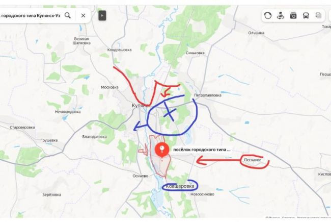 Чтобы оценить, откуда был совершён прорыв, воспользуемся картой испанского ОСИНТ-ресурса Suriyakmaps. Его автор пишет, что «к востоку от Купянска российские войска взяли под контроль половину Песчаного (см. схему) и расширили свой контроль вдоль железной дороги до окраин Куриловки и вдоль дороги на Петропавловку». Там российские войска возобновили наступление в северной части местности, пока не окопались в складах в центре.