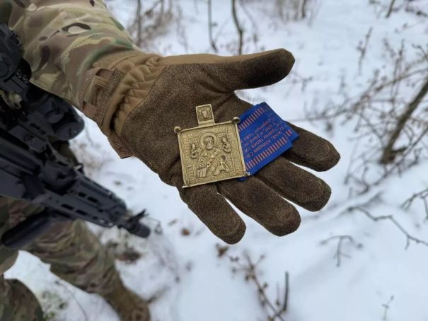 Морпех достает из кармана иконку Николая Чудотворца.