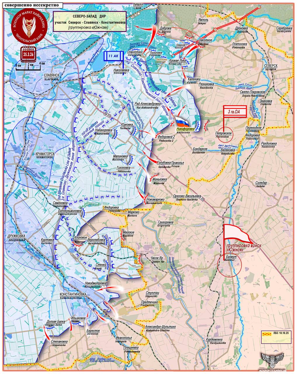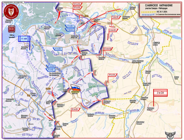 Обратите внимание на желтые пунктирные линии - это контуры ЛБС от 10.10.2025 г. и от 24.11.2025 г. . Наглядная демонстрация того, как «полтора года топтавшееся на месте» Северское направление делает рывок и уходит далеко на запад. Всему свое время в соответствии с замыслом Генштаба. Источник