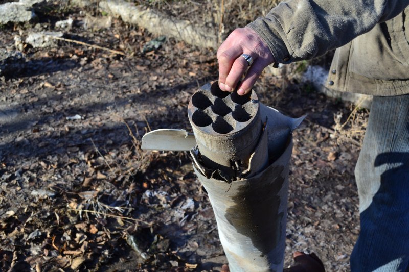 На дорогах и возле строений полно воронок, кучи гильз и части от реактивных снарядов.
