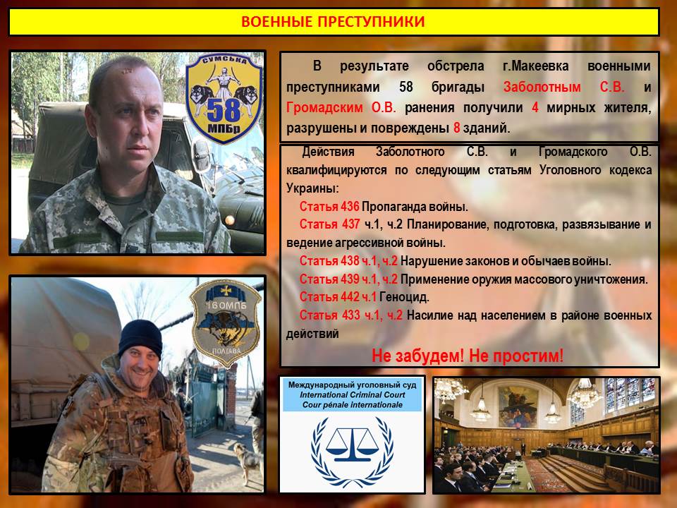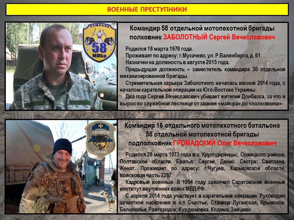 В частности, по сведениям Минобороны, приказы о целенаправленных обстрелах жилых кварталов Макеевки отдавали командир 58 отдельной мотопехотной бригады ВСУ, полковник Сергей Заболотный и командир 16 отдельного мотопехотного батальона 58 отдельной мотопехотной бригады, подполковник Олег Громадский.