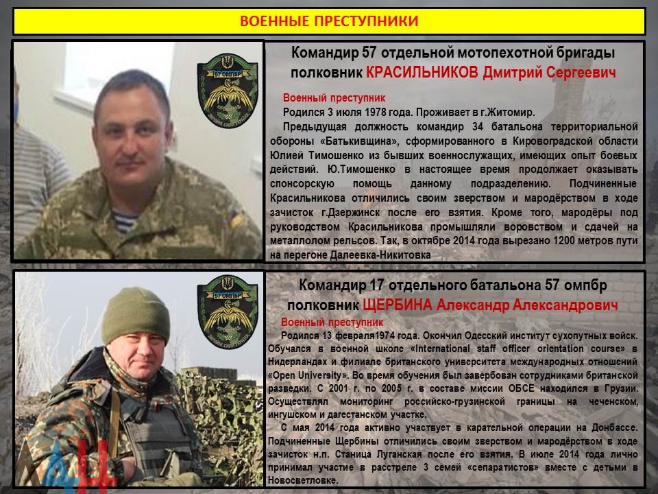 По данным Минобороны, обстрелы жилых кварталов под Горловкой производились по приказам включенных в перечень командиров 17 отдельного батальона 57 омбр полковника Александра Щербины и командира отдельной 57 омбр полковника Дмитрия Красильникова.