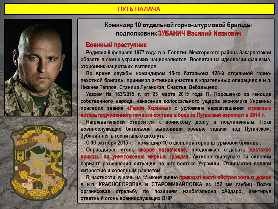 Приказ на обстрел жилых районов Старомихайловки на западной окраине Донецка и оккупированной Красногоровки был отдан командиром 10-й отдельной горно-штурмовой бригады ВСУ Василием Зубаничем. Об этом говорится в очередном досье на военных преступников Украины, которое составляет оперативное командование ДНР.