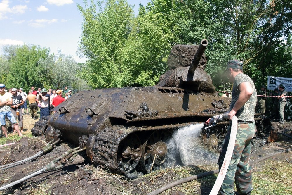 Через 40 минут танк стоял на пригорке, пожарные из брандспойтов сбивали с него грязь и ил. Открытый люк механика-водителя чернел входом в историю. "Я от отца слышал, экипаж там", - авторитетно заявил кто-то из местных. Заглянувшие в Т-34 военные не нашли мертвых танкистов - только живых раков, которые были очень недовольны переменой обстановки. Выбравшись через люк, они двинулись обратно в реку. Источник