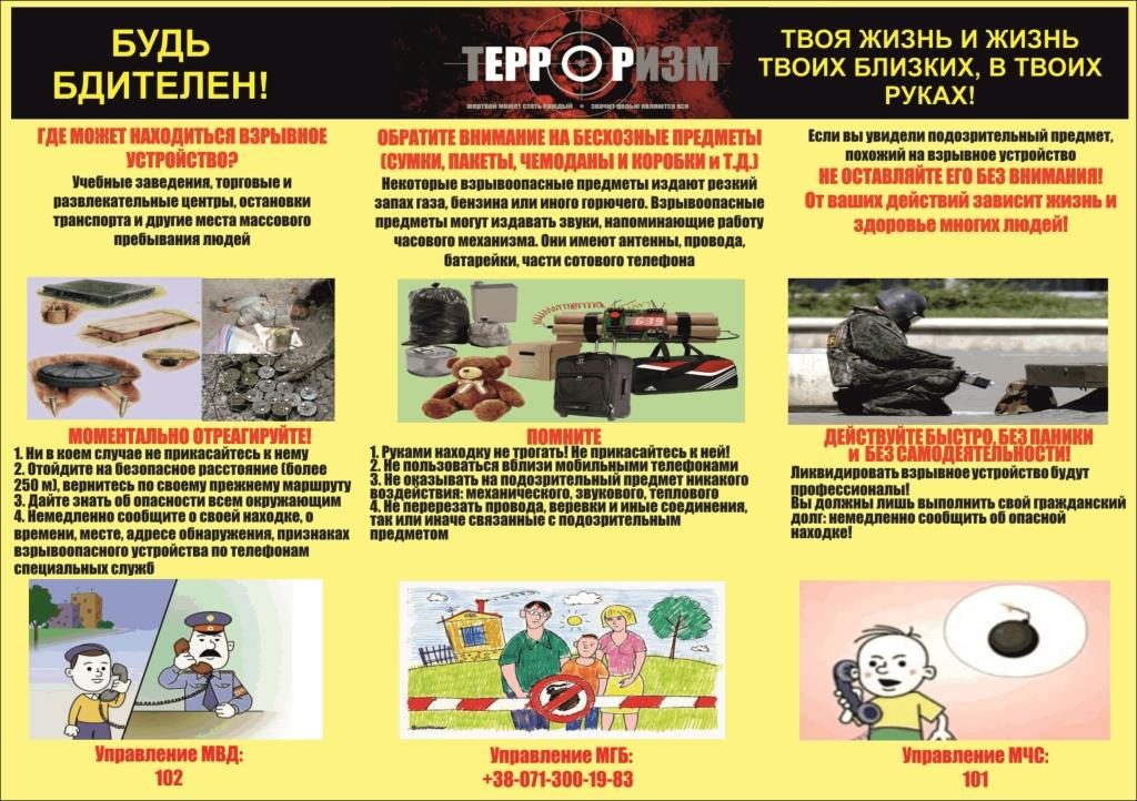 «В связи с террористической угрозой в Республике, вызванной активизацией сил специальных операций ВСУ, командованием и руководством МГБ, МВД, МЧС разработаны плакаты для информирования населения о признаках взрывных устройств и действиях жителей в случае их обнаружения», — сказал замкомандующего.