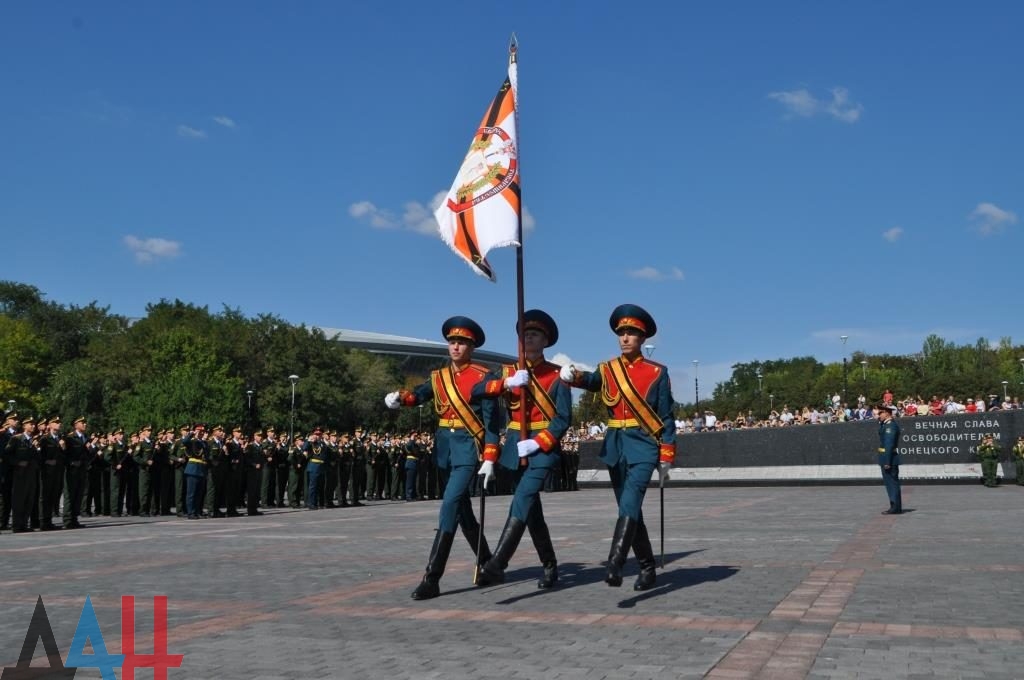 Вначале на площадку перед памятником вынесли государственный флаг Донецкой Народной Республики и знамя ДонВОКУ. Военный оркестр исполнил гимн ДНР. Затем началась непосредственно церемония присяги. В ходе нее курсанты по одному выходили из строя и зачитывали текст клятвы перед своими товарищами. Церемония завершилась парадом курсантов и преподавателей ДонВОКУ.