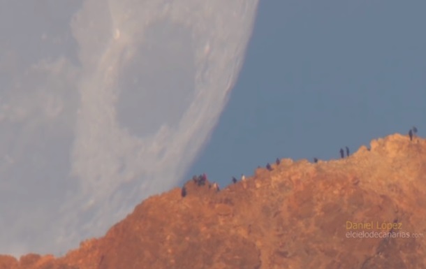 Впечатляющее зрелище было снято в горах Канарских островов. Съемка проводилась при помощи длиннофокусного объектива с расстояния в 16 километров. За счет этого кажется, что луна размером с гору, а люди - совсем крошечные.