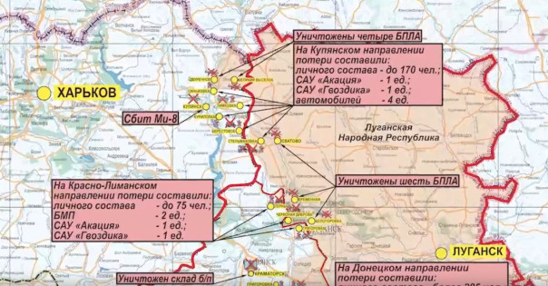 На Купянском направлении ударами авиации, огнем артиллерии и тяжелых огнеметных систем «Западной» группировки войск поражены подразделения противника в районах населенных пунктов Синьковка, Куриловка Харьковской области и Стельмаховка Луганской народной республики. В районах населенных пунктов Берестовое и Тимковка Харьковской области пресечены действия двух украинских диверсионно-разведывательных групп. Потери противника за сутки составили до 170-ти украинских военнослужащих, четыре автомобиля, а также самоходные артиллерийские установки «Гвоздика» и «Акация».
