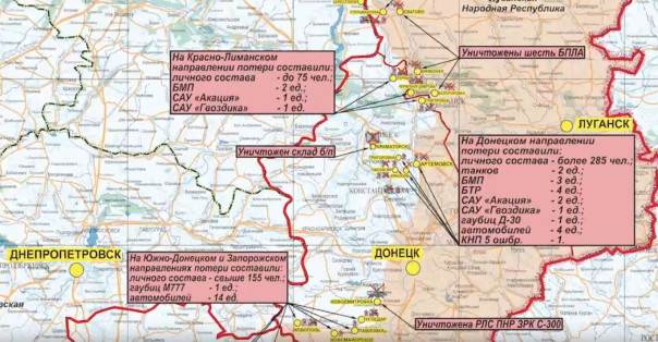 За прошедшие сутки в данном районе авиацией совершено девять самолетовылетов. Артиллерией группировки выполнено 98 огневых задач. За сутки на данном направлении уничтожено более 285-ти украинских военнослужащих и наемников, два танка, три боевые машины пехоты, четыре бронетранспортера, четыре автомобиля, две самоходных гаубицы «Акация», самоходная артиллерийская установка «Гвоздика», а также гаубица Д-30. Кроме того, в районе города Краматорск Донецкой народной республики уничтожен склад ракетно-артиллерийского вооружения группировки ВСУ.