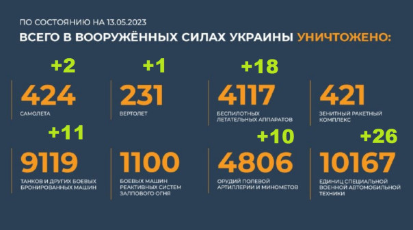 Всего уничтожено в вооруженных силах Украины на 13.05.2023. Брифинг Минобороны