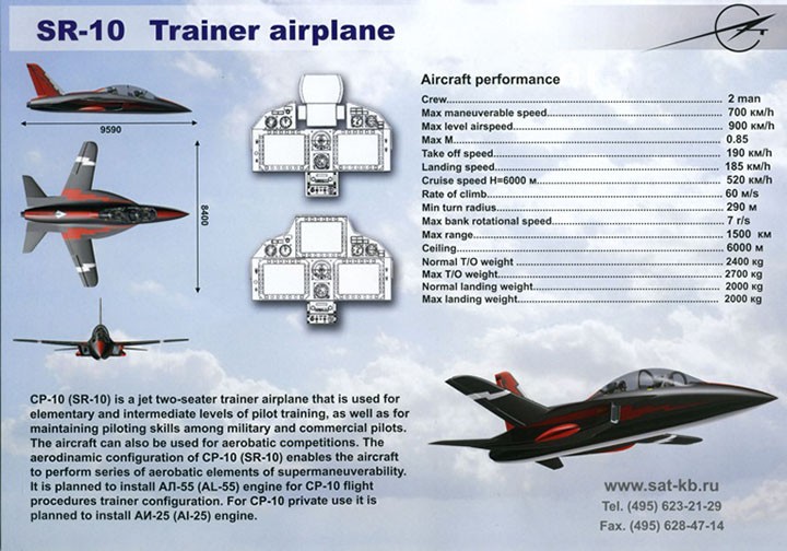 – Зачем сажать курсантов, которым предстоит летать на Як‑130, а потом на строевых «МиГах» и «Сухих», на винтовую машину с поршневым двигателем? Это же анахронизм! СР‑10 – вот идеальная учебно-тренировочная машина, самолёт-парта. Кабина пилотов по размерности, объёму и обзору специально соответствует нормативам боевой авиации. Предусмотрена возможность подвесок вооружения для учебных стрельб и пусков ракет. Источник