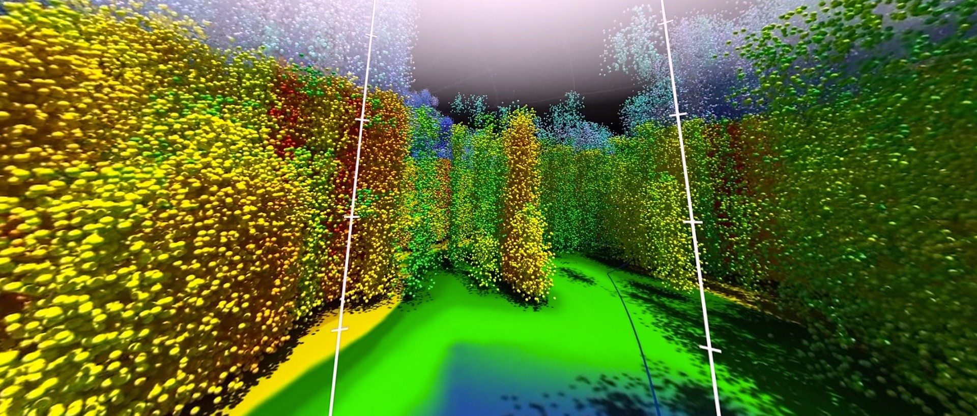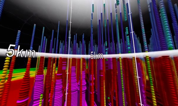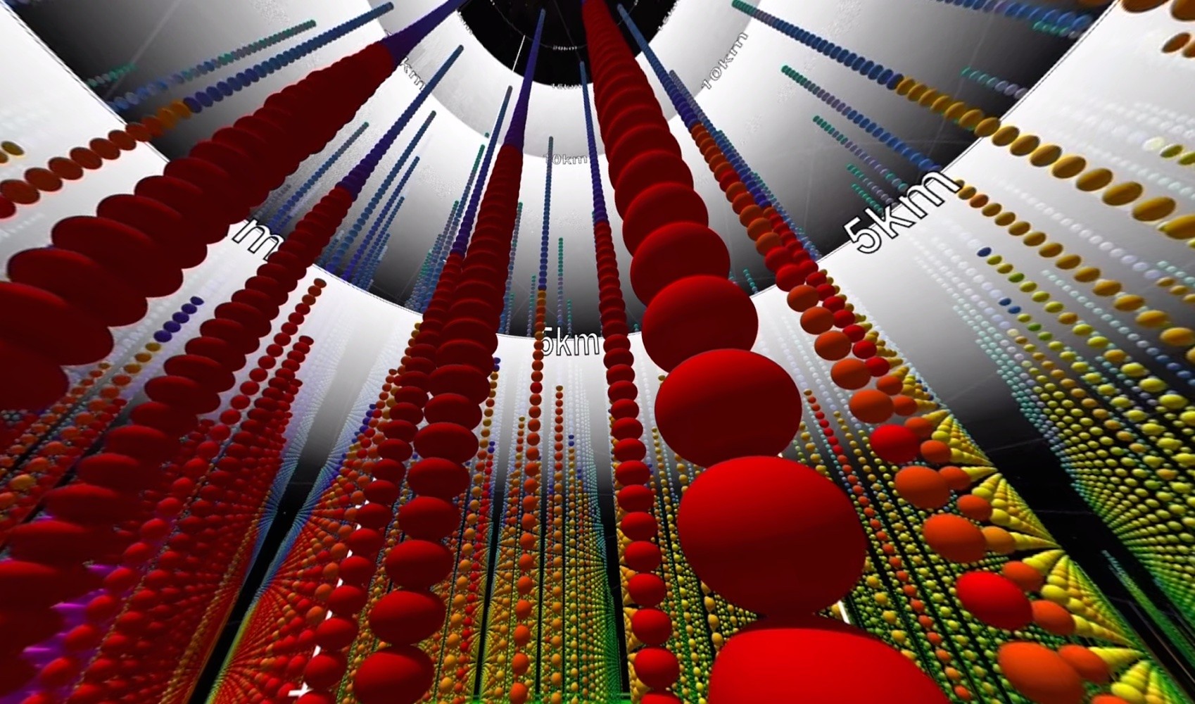 Спустя полторы минуты после начала видео (на 1:29) точки превращаются в числа, которые обозначают количество выпавших осадков в миллиметрах в час: приблизительно от 0,5 мм/ч до 150 мм/ч. Этот же параметр в виде эллипсоидов иллюстрирует явление с другой стороны: обильные осадки – красные или фиолетовые, низкие — сферические зеленые или желтые, а для снегопада выбран спектр от фиолетового до синего.