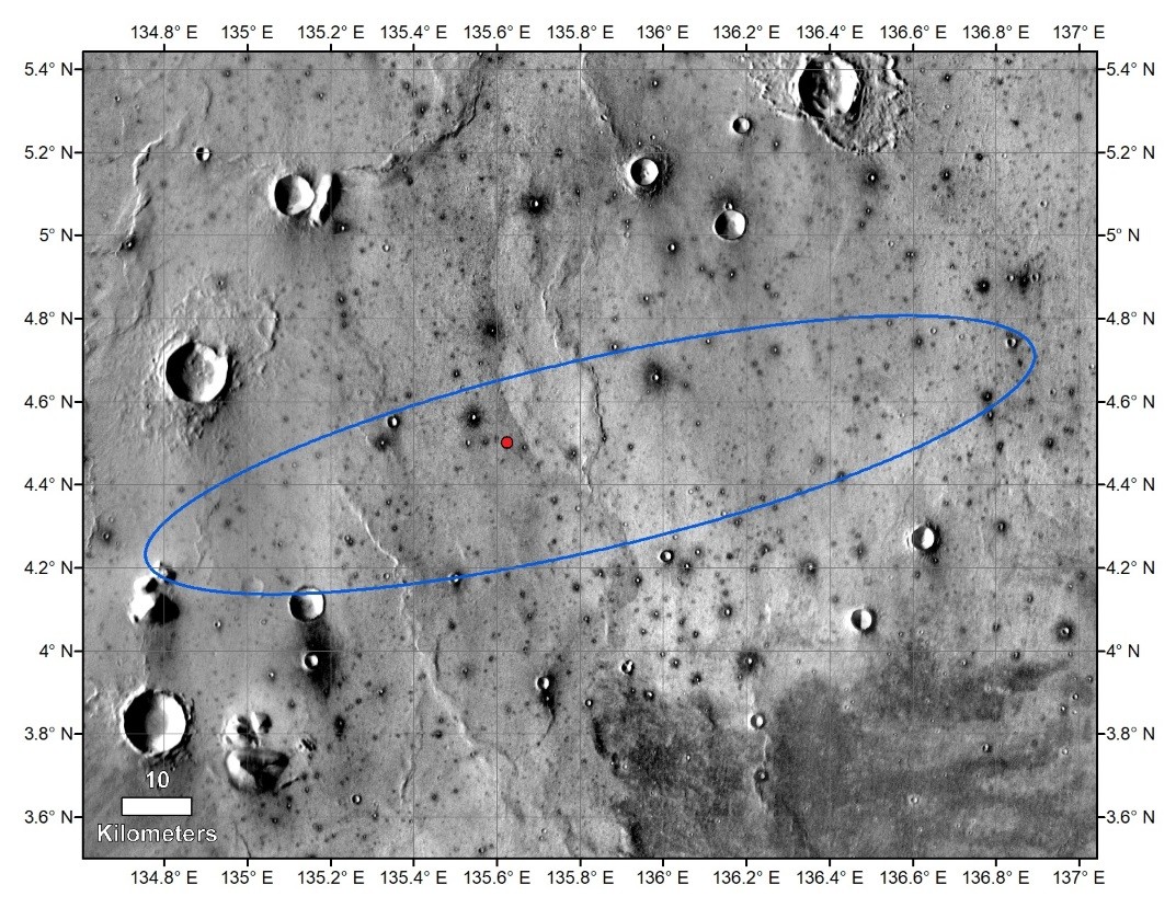 Расчетный посадочный эллипс InSight с отмеченным реальным местом посадки станции (аннотированная версия).