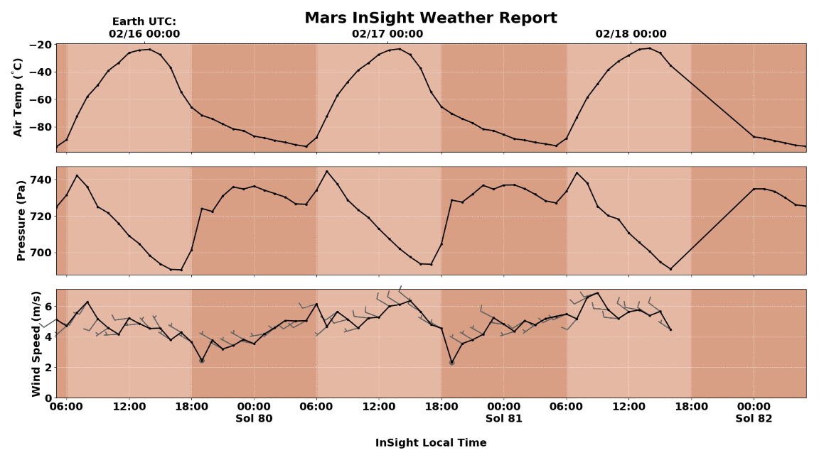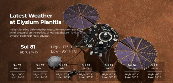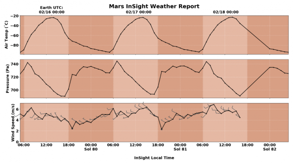 19 февраля NASA приступила к публикации ежедневных метеотчетов с Марса. Они составляются по результатам измерений, проводимых станцией InSight. Отчет содержит данные о максимальной и минимальной зафиксированной температуре, значении атмосферного давления и скорости ветра.
