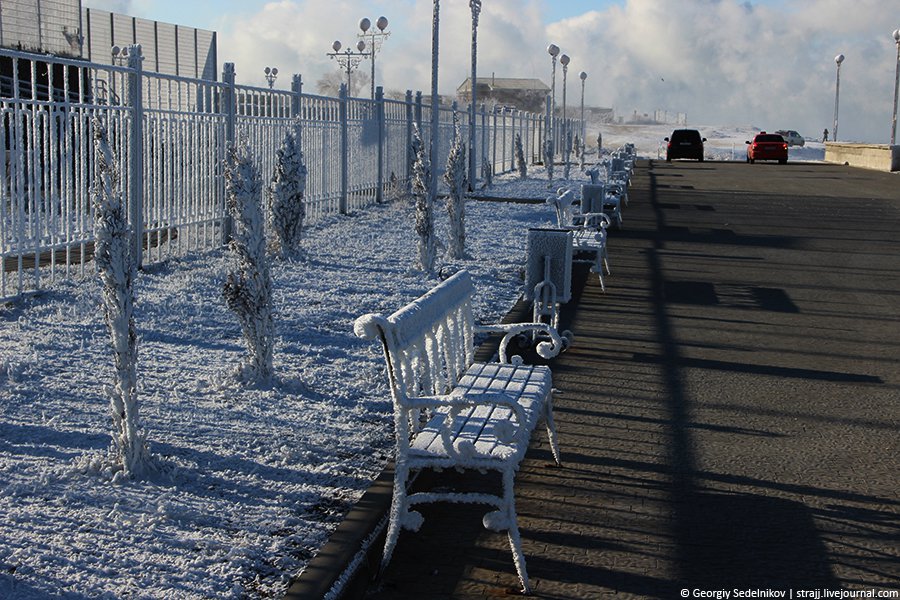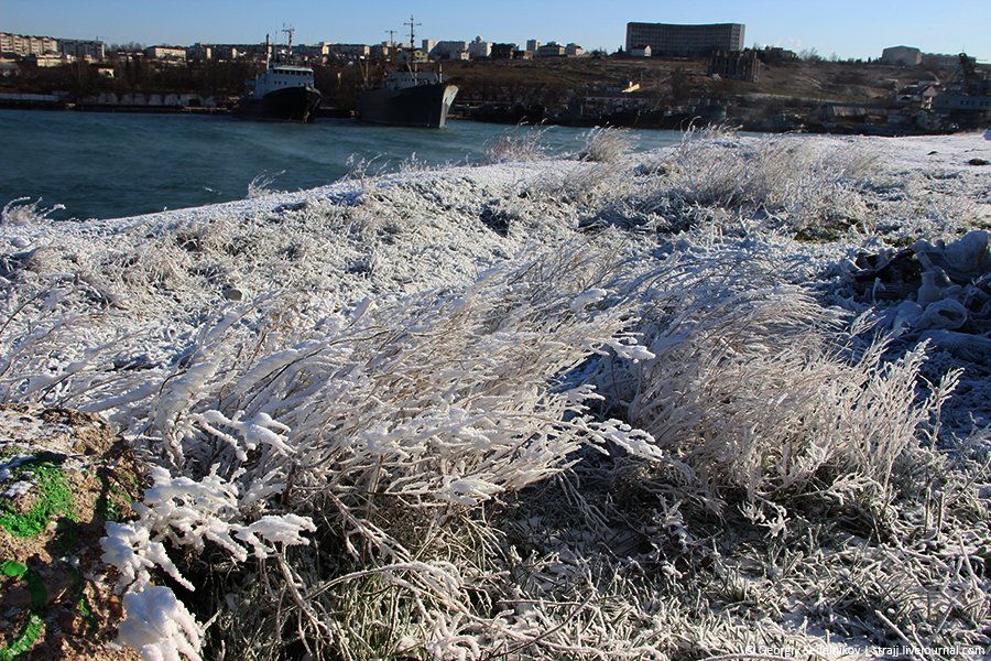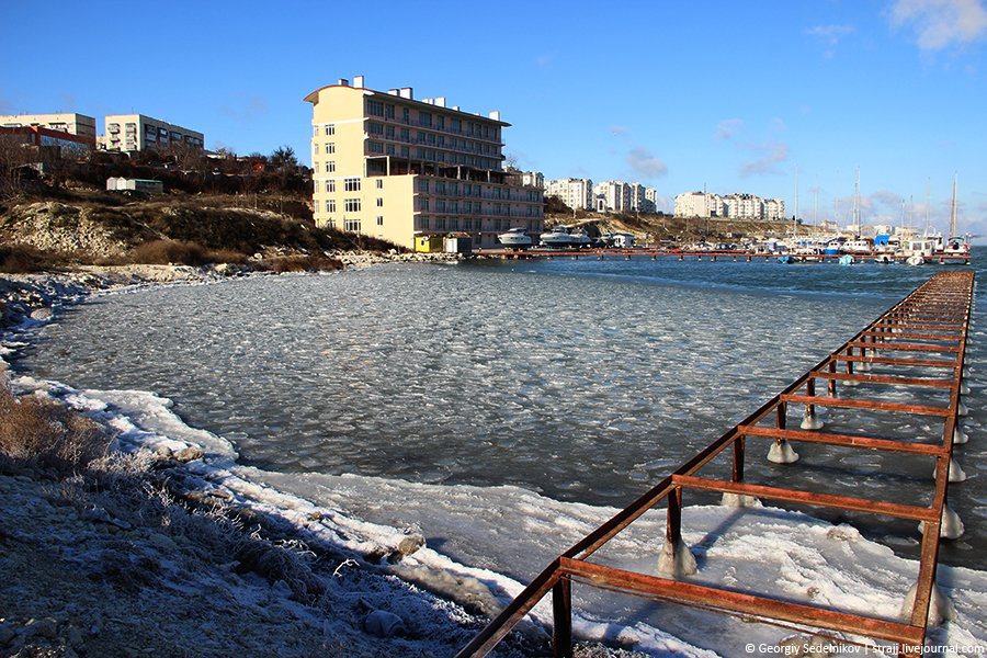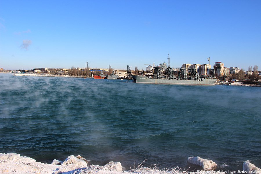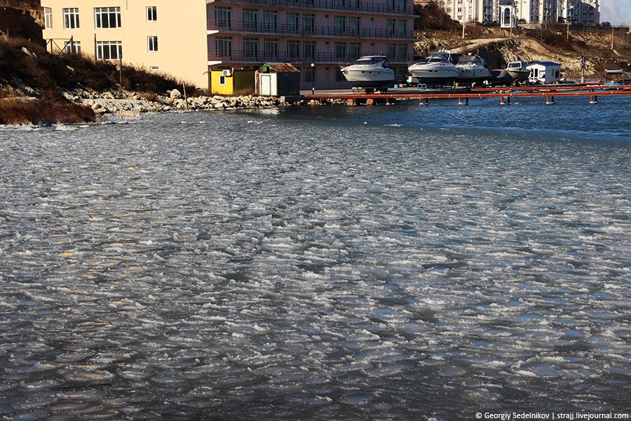 Продолжаю серию репортажей из замёрзшего Севастополя. Вчера у нас было всего -12, а сегодня было уже -17 и море начало замерзать.