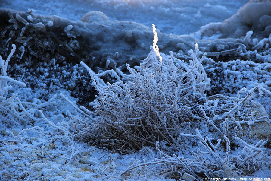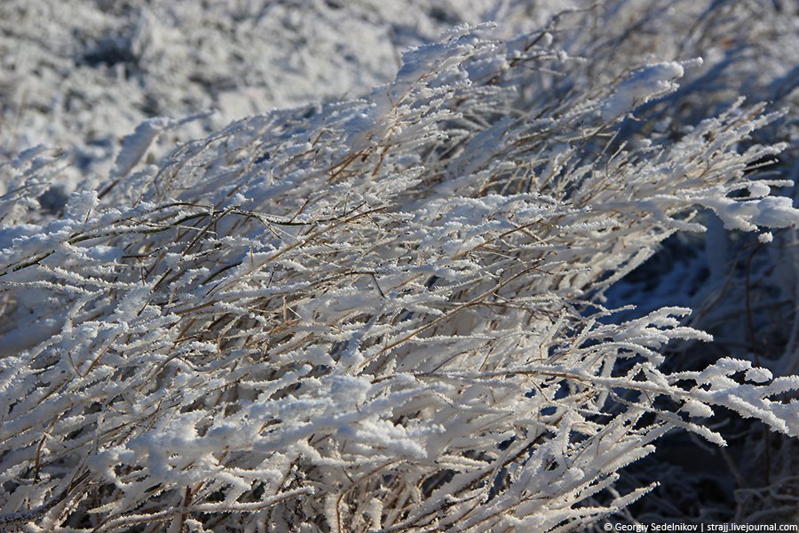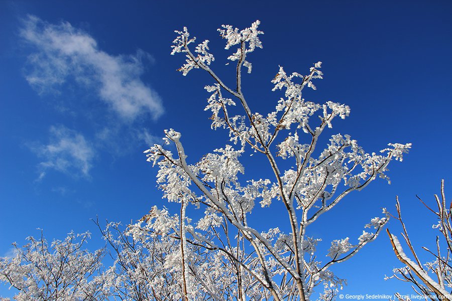 Налипшее испарение от моря превратило деревья и кусты в красивые снежные скульптуры