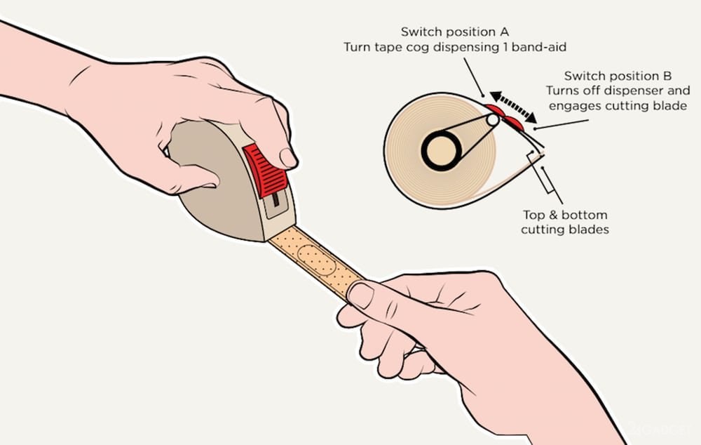Внутри изобретения размещается рулон из лейкопластырей. На корпусе диспенсера есть переключатель, который выталкивает наружу один отрезок ленты длиной 4 см. Благодаря нанесенной перфорации лейкопластырь легко отсоединяется от рулонной части. После использования устройство закрывается, чтобы оставшийся лейкопластырь оставался стерильным.