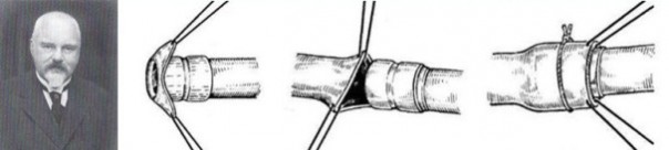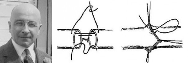 Каррель (1873-1944) предложил с помощью, трёх швов-держалок, растягивающих круглый просвет сосуда, превращать его в треугольный, и обвивными непрерывными швами сшивать, выворачиваемые внутренней оболочкой (интимой) навстречу друг другу, края сосудистых стенок-сторон треугольника.