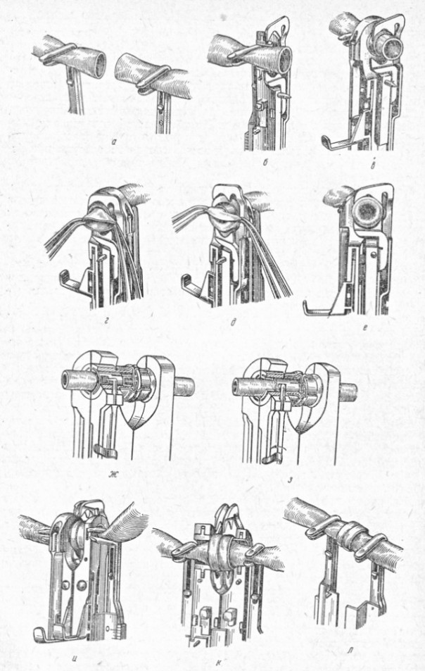 ж – половины аппарата с разбортованными концами сосуда сближены для сшивания;